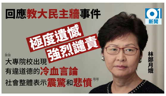 對於教大冷血標語事件,香港特首林鄭月娥8日發表聲明,形容有關字句“極之涼薄和侮辱”,是有違道德的冷血言論,對此感到十分遺憾,並予以強烈譴責。另外,林鄭對近日多間大學校園張貼“港獨”標語予以譴責,稱言論有違“一國兩制”,強調學術自由和院校自主並非鼓吹歪論的藉口,期望校方儘快採取適當行動,社會共同作出糾正。