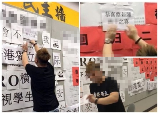 從視頻中可見,一名身穿寫着“香港獨立”黑T恤的青年男子,先後在“民主牆”上貼上至少兩張紙張,紙上寫有“恭喜蔡若蓮”的字句,他身旁有一名年輕女子協助遞上紙張。