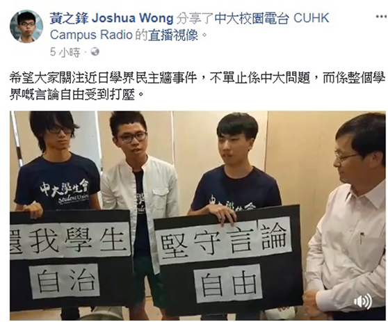 因衝擊香港政府總部東翼前地而被改判入獄的黃之鋒,其社交網站也有新貼文呼籲關注事件,宣稱“整個學界言論自由受打壓”,但未知貼文是如何發出。