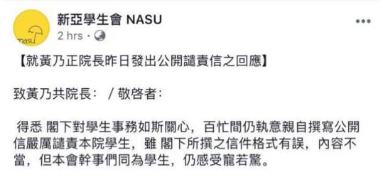 但不幸的是,黃院長刊文翌日,新亞書院學生會在“臉書”上回嗆黃院長,宣稱周豎峯是“情緒失控下一時失言”,反倒是黃院長的譴責信“格式有誤,內容失當”。