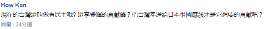 對於李登輝吹捧賴清德,台網友譏諷,真是“臭味相投”,“無論試多少次,結果一樣是虛耗時間的幻想,白痴的‘台獨’”,“把台灣送給日本祖國應該才是他最想要的吧”。