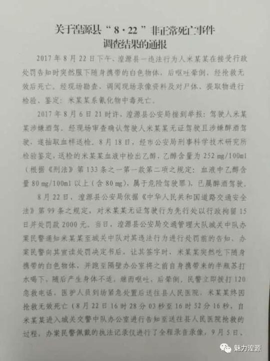 “湟源公安”微信公號9月12日消息,2017年8月22日下午,湟源縣一違法行為人米某某在接受行政處罰告知時突然服下隨身攜帶的白色物體,後嘔吐暈倒,經搶救無效後死亡。經現場勘查、調閲現場錄像資料及對屍體、提取物進行檢驗、鑑定:米某某系氰化物中毒死亡。