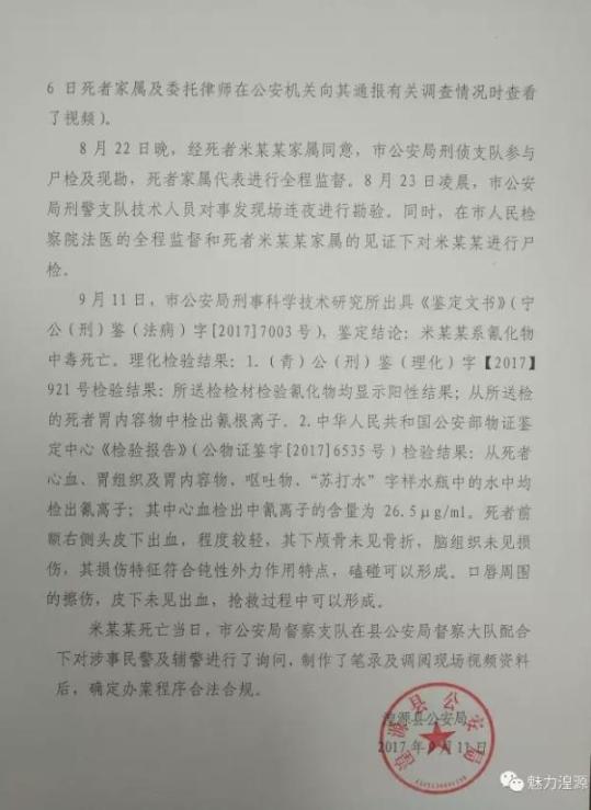 9月11日,市公安局刑事科學技術研究所出具《鑑定文書》(寧公(刑)鑑(法病)字[2017]7003號),鑑定結論:米某某系氰化物中毒死亡。理化檢驗結果:1.(青)公(刑)鑑(理化)字【2017】921號檢驗結果:所送檢檢材檢驗氰化物均顯示陽性結果;從所送檢的死者胃內容物中檢出氰根離子。2.中華人民共和國公安部物證鑑定中心《檢驗報告》(公物證鑑字[2017]6535號)檢驗結果:從死者心血、胃組織及胃內容物、嘔吐物、“蘇打水”字樣水瓶中的水中均檢出氰離子;其中心血檢出中氰離子的含量為26.5μg/ml。死者前額右側頭皮下出血,程度較輕,其下顱骨未見骨折,腦組織未見損傷,其損傷特徵符合鈍性外力作用特點,磕碰可以形成。口唇周圍的擦傷,皮下未見出血,搶救過程中可以形成。