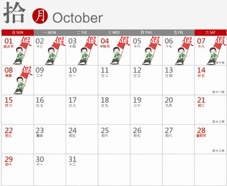 根據國務院辦公廳通知精神,2017年中秋節、國慶節放假安排如下:10月1日(星期日)至10月8日(星期日)放假調休,共8天。9月30日(星期六)上班。