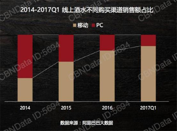 消費者移動端購物的消費習慣日漸養成,越來越多的拇指一族選擇從手機端選購酒水。2017年第一季度,超過八成的線上酒水銷售額來自移動端。