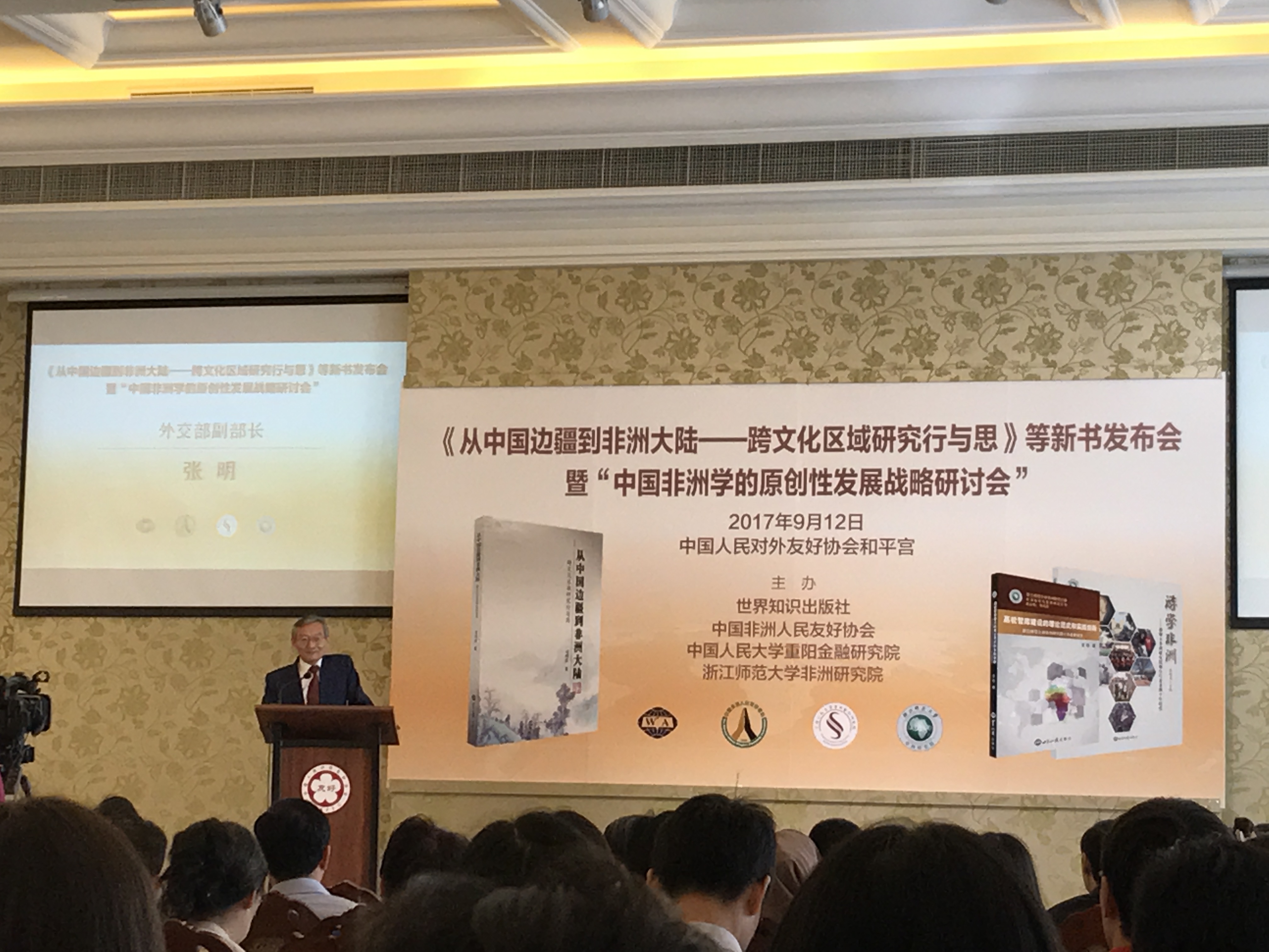 2017年9月12日,《從中國邊疆到非洲大陸——跨文化區域研究行與思》等新書發佈會暨“中國非洲學的原創性發展戰略研討會”在中國人民對外友好協會和平宮隆重舉行,由世界知識出版社、中國非洲人民友好協會 、中國人民大學重陽金融研究院和浙江師範大學非洲研究院聯合舉辦。張明副部長等外交部領導以及各高校、科研機構的專家學者齊聚一堂,共同祝賀新書出版,並針對新時期中國的非洲學展開了研討。除了國內媒體外,還有六個非洲國家媒體代表參加。