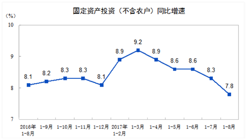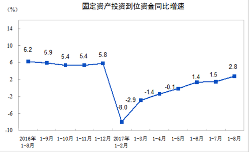 人們最關注的投資數據方面,1-8月固定資產投資同比增速7.8%,不僅是年內最低,也創下1999年以來新低。不過,從到位資金情況看,前8月同比增長2.8%,增速比1-7月份提高了1.3個百分點。