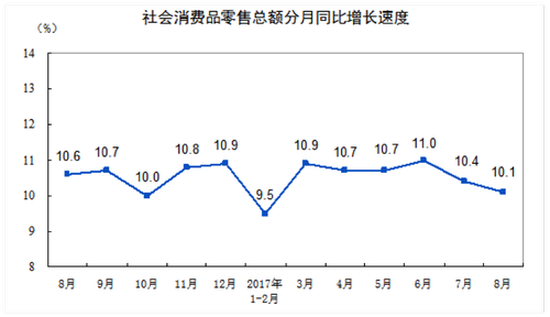 再看需求結構。8月,體育娛樂用品類消費同比增長14.9%,通訊器材類消費同比增長了12.2%,增速都在兩位數以上,消費升級類產品增長比較快。