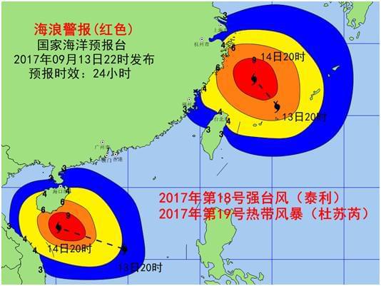 受今年第18號強颱風“泰利”的影響,預計:9月13日夜間到14日夜間,東海南部將出現8到12米的狂浪到狂濤區,近海海域海浪預警級別為橙色;浙江沿岸海域將出現4到6米的巨浪到狂浪,該沿岸海域海浪預警級別為紅色;福建北部沿岸海域將出現3到4米的大浪到巨浪,該沿岸海域海浪預警級別為黃色;上海沿岸海域將出現2.5到3.3米的大浪,該沿岸海域海浪預警級別為藍色。
