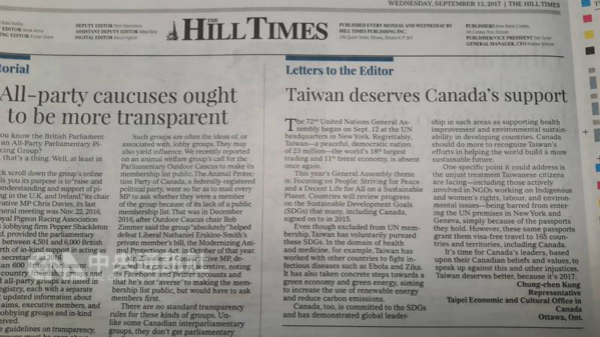 海外網9月14日電 第72屆聯合國大會於當地時間12日在紐約聯合國總部開幕,不具參會資格的台當局只能發表酸言酸語來製造事端,甚至不斷自我炒作。台“駐加拿大代表”龔中誠今日(14日)在加拿大媒體《國會山莊時報》(The Hill Times)上投書,聲稱“台灣值得加拿大支持”,還拉攏加拿大總理“為台灣挺身而出”。
