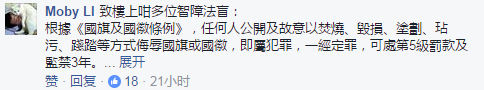國旗法及區旗法規定,任何人公開及故意以焚燒、毀損、塗劃、玷污、踐踏等方式侮辱國旗、國徽、區旗及區徽,即屬犯罪,一經定罪,最高可判罰款五萬元及監禁三年。