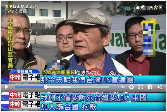據台灣《中時電子報》報道,15日上午,20多名台灣“入聯”宣達團成員在美國街頭持“台獨”標語,叫囂“入聯”。但有趣的是,團長蔡明憲在接受訪問時,把“加入聯合國”講成了“加入中國”。這一幕採訪視頻也被台灣媒體直播,引發網絡熱議。