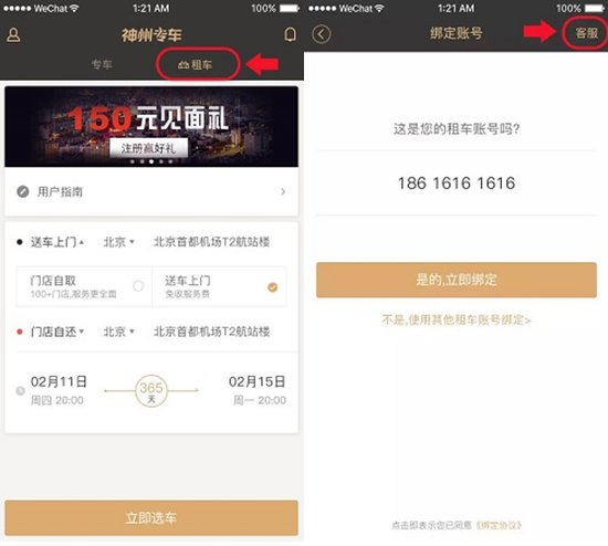 記者將神州專車APP更新至最新的4.3版後發現,軟件界面新增“租車”入口,直接可以預訂神州租車全國各地的車輛。首次使用系統會提示綁定神州租車賬户,綁定之後就可以直接下單了。