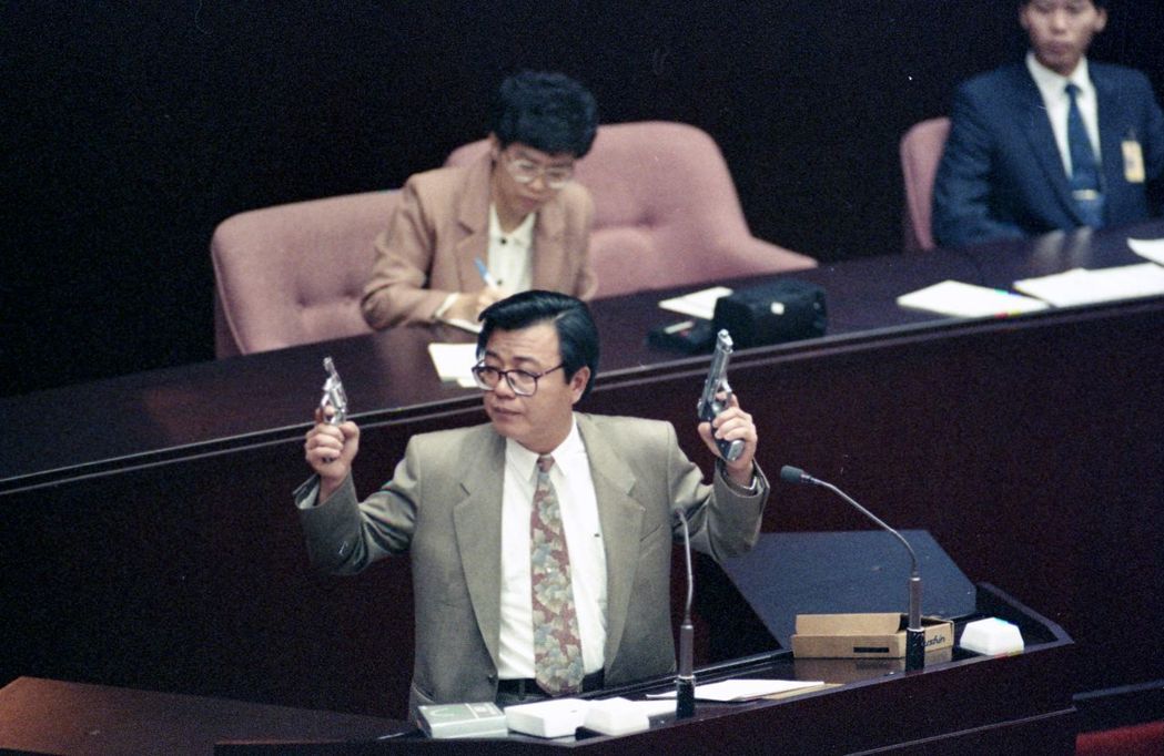 電擊棒、催淚瓦斯算神馬,這兒還有手槍呢!1993年,“立委”賴英芳拿着手槍道具質詢,可是讓大家“吃了一鯨”。