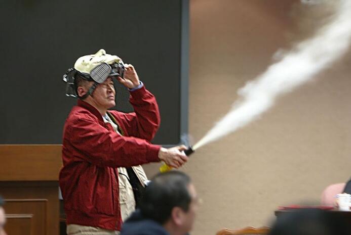 為阻止軍購案,李敖還大鬧“程序委員會”,不但耍弄電擊棒,還拿出防狼噴霧器在會場猛噴催淚瓦斯,嗆得藍綠“立委”眼淚直流。
