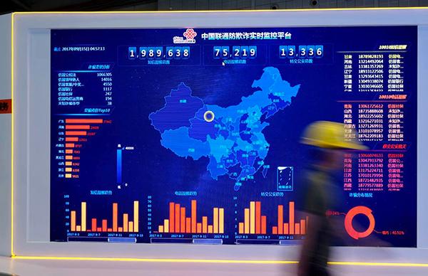 圖説:中國聯通防欺詐即時監控平台。展會上,各大網絡運營商和網絡平台的防詐騙平台和技術成為本次展會的一大亮點。新民晚報記者 劉歆 攝