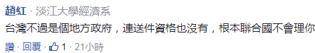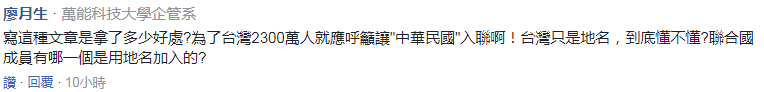有網友稱,“(這次)又花了多少錢?”,“寫這種文章時拿了多少好處,台灣只是地名,聯合國成員有哪一個是用地名加入的”,“阿三也是戲太多,可能拿了兩個億的片酬”。
