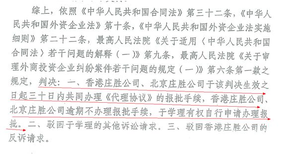 北京市中倫文德律師事務所張璐律師在接受環球網採訪時表示,根據北京市一中院於2011年12月20日做出的(2012)一中民初字第3746號民事判決書和北京市高級人民法院於2012年8月10日做出的(2012)高民終字第840號民事判決書,於學理簽署之代理協議作為股權轉讓協議已依法成立,且於學理已經履行協議約定義務,於學理應取得北京莊勝公司5%股東權益,故此判決北京莊勝公司辦理股權轉讓報批手續。另外,2016年,全國人民代表大會常務委員會《關於修改<中華人民共和國外資企業法>等四部法律的決定》已取消了對外資企業股權變更審批的要求,改為備案制。基於上述生效判決和法律變更,無論之前是否經過商務部門審批,也無論是否辦理工商變更登記,於學理均已合法取得北京莊勝公司5%股權並享有股東權益,這是本案的基本前提和根本。