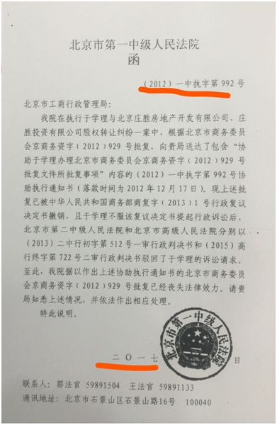 10天后,於學理在北京市工商局拿到了一份寫有2017年5月22日,北京市第一中級人民法院給北京市工商局的一份標有“(2012)一中執字第992號”的函件。該函件稱,一中院在執行於學理和北京莊勝、莊勝投資有限公司股權轉讓糾紛一案中,據以做出協助執行通知書的批覆已喪失法律效力,請工商局知悉上述情況,並依法做出相應處理。