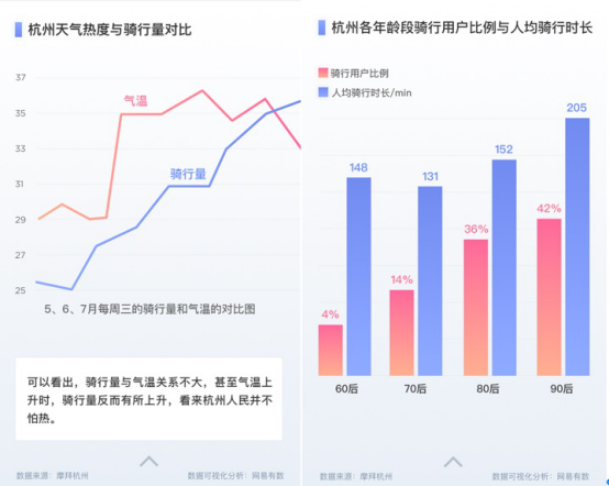 此外,數據顯示,杭州路面上的騎行量與氣温關係並不大,甚至氣温上升時,騎行量反而有所上升,看來杭州人民並不怕熱。同時,騎行最遠的距離甚至達到29.42公里,最高速度達到20公里每小時。