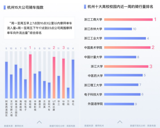 有趣的是,這份報告還對杭州各大公司和高校的騎行指數做了排名,比如在“週一至週五早上7點到10點3公里以內摩拜單車流入量+週一至週五下午17點到23點公司周圍摩拜單車向外流出量”兩項指數的綜合排名中,前五名的依次是娃哈哈、UT斯達康、19樓、傳化、阿里巴巴西溪園區、網易濱江園區。而吉利汽車、萬向僅排名第14和第15名,看來汽車相關的公司員工不傾向於騎自行車上下班。