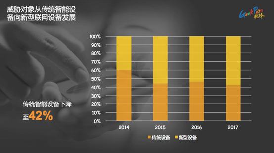 根據極棒實驗室統計數據顯示,新型智能安全威脅比重從2014年的40%上升至如今的58%。而這些新型智能設備的出現就為攻擊者提供了巨大的“機會”。