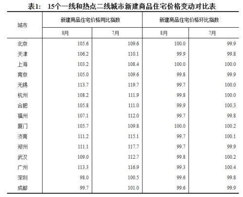 關注度較高的15個熱點城市房價走勢如何?國家統計局城市司高級統計師劉建偉表示,8月份,15個一線和熱點二線城市,從環比看,新建商品住宅價格下降或持平;從同比看,新建商品住宅價格漲幅均繼續比上月回落,回落幅度在1.3至6.6個百分點之間。