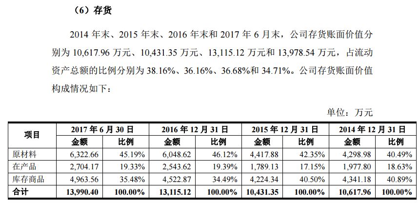 此外,招股書第315頁文字描述部分披露的2017年上半年末存貨餘額為13978.54萬元,與明細表中的存貨餘額13990.4萬元相比,存在明顯差異,而這種情況未見於以前年度。