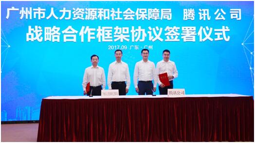 9月18日,廣州市人力資源和社會保障局(廣州市人社局)與騰訊互聯網+合作事業部簽署框架協議,廣州市委副書記、市長温國輝、廣州市人力資源和社會保障局局長郭志勇、騰訊公司董事會主席兼首席執行官馬化騰、騰訊互聯網+戰略總經理張巍等出席簽約儀式,雙方將攜手加快人社服務從線下向移動化轉移。