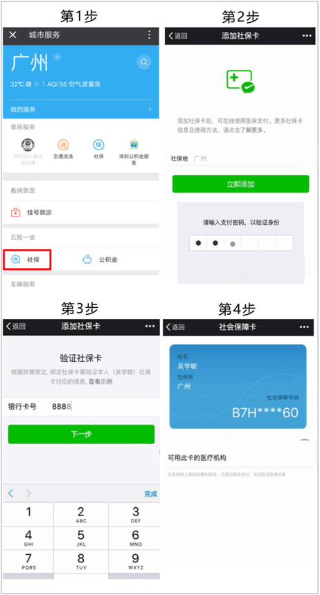將來,微信醫保支付在廣州開通後,參保人點擊微信“城市服務”,按提示操作,只需輕鬆四步即可一鍵綁定社保卡。