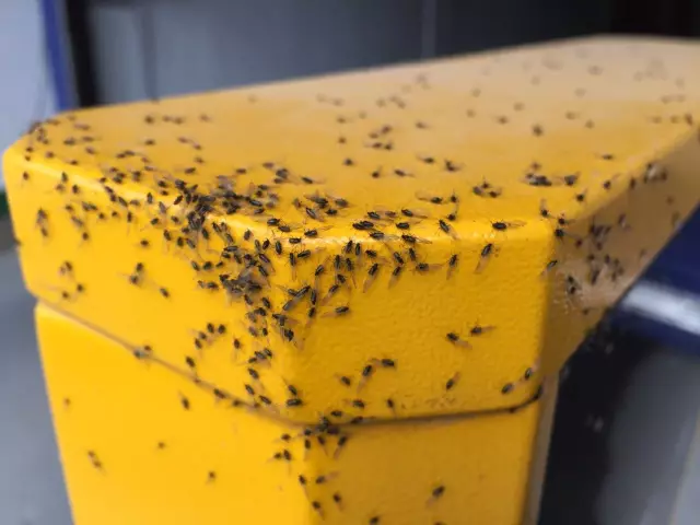 任你是抹着粉底的少女,還是彪形大漢,見到這些飛蟲,也只能戴上口罩,或是矇住腦袋快走幾步,絕對不想跟它硬碰硬。遇到穿着黃色制服的工作人員,原本漫無目的的飛蟲,一下子就找到了目標。