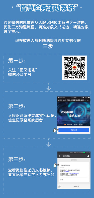 例如,通過“智慧檢務輔助系統”,當事人只需三步即可隨時隨地接受通知文書:首先,關注“正義渝北”微信公眾平台;其次,通過騰訊慧眼完成實名認證,信息記錄至後台系統;最後,查看微信推送的文書模板。以往可能需要幾天時間才能送達的案件文書,現在通過微信公眾平台即時抵達,免去了當事人的奔波之苦。
