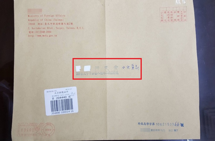 蔡英文當局所謂“外交部”寄給國民黨的公文信封,原本用印“中國國民黨”,卻又十分突兀地以修正帶把“中國”兩字塗銷掉,引起國民黨不滿。(台媒圖)