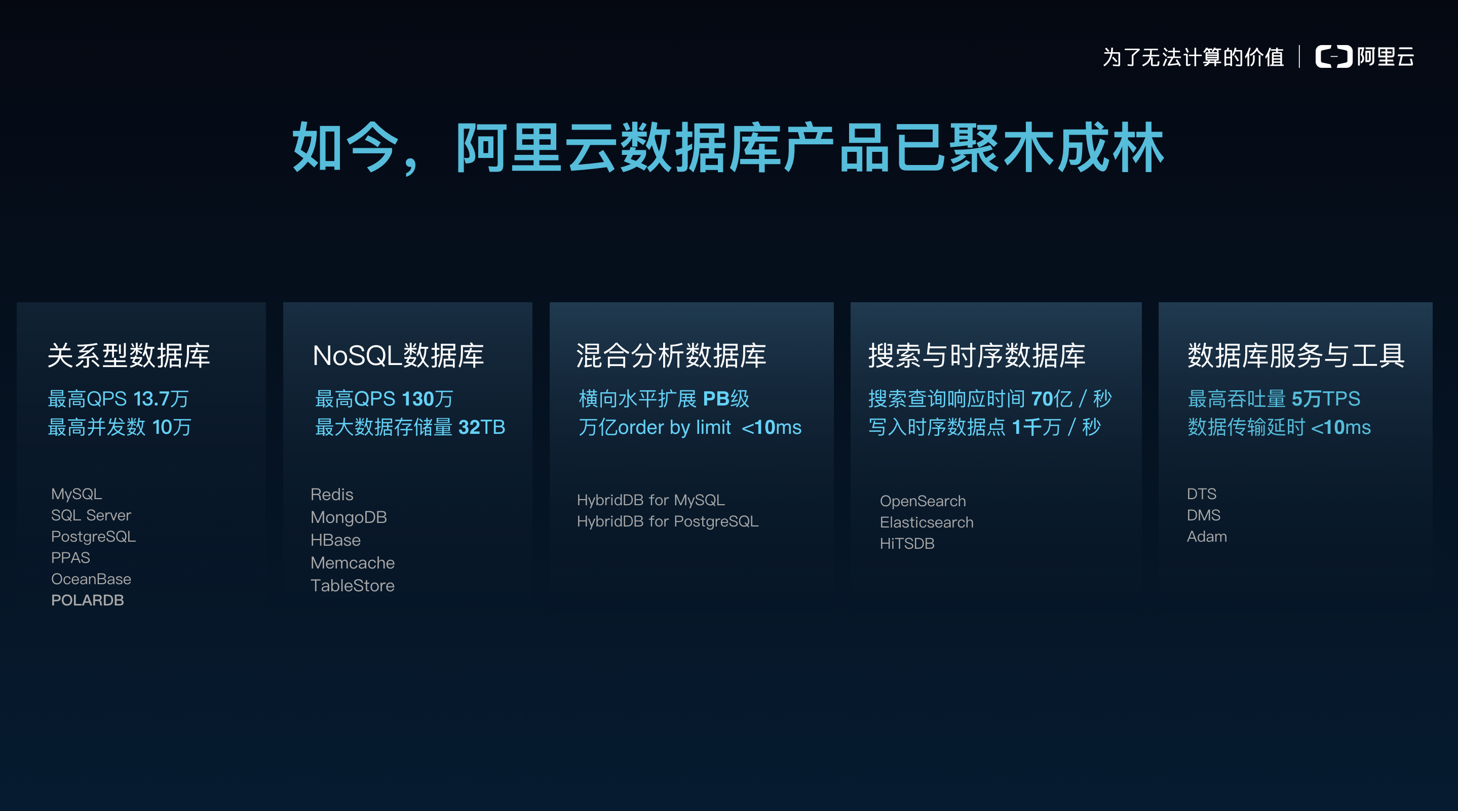 在此基礎上,阿里雲數據庫家族已完成世界上主流的關係型、鍵值型、文檔型、搜索型、時序型、列式數據庫引擎的佈局,將在硬件和數據庫源碼上的多年技術積累轉化為產品優勢,助力企業佈局未來。