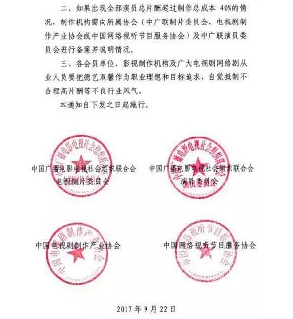 隨着我國影視行業的不斷發展,產業規模不斷擴大,創作播出了一批優秀影視作品,但也出現少數演員不合理高片酬現象,導致影視劇製作成本結構不合理,收入分配比例失衡,影響影視劇整體質量的提升。為貫徹落實五部委聯合下發的《關於支持電視劇繁榮發展若干政策的通知》和全國電視劇工作座談會有關精神,引導製作企業合理安排電視劇投入成本結構,優化片酬分配機制,弘揚“戲比天大”的職業精神,形成良好行業風氣,推動影視行業投入與產出的良性循環,促進行業持續健康發展,現通知如下: