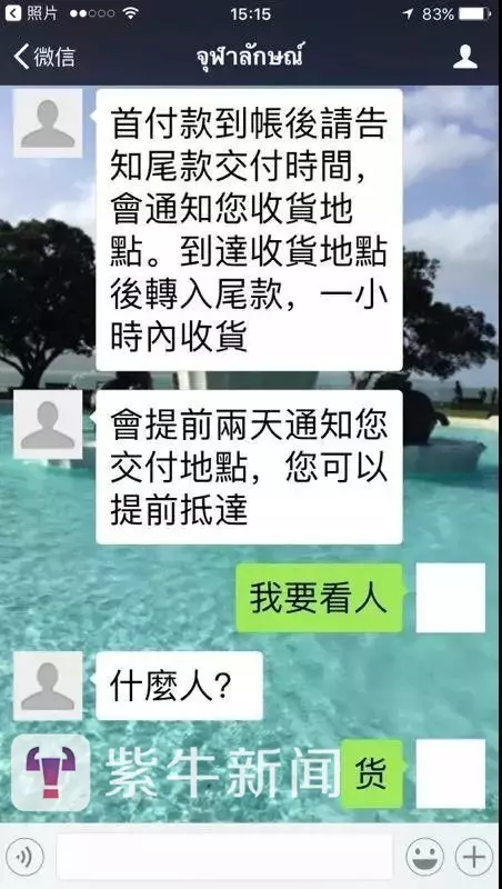 第二天,正在一家人開始為老駱擔心之時,他們卻收到了泰文名字的微信消息,説駱先生已經被限制了人身自由。“第一次是撥了語音電話給我母親,裏面放了一段電子合成音,自稱泰國皇家警 察,説你父親因為涉嫌攜帶毒品進入泰國被抓,但是此事可以私了,需要人民幣300萬,我母親很害怕就把電話掛了。”紫牛新聞記者在駱先生出示的聊天記錄中看到,對方不斷提出要求,並寫道“人民幣300或美金45或紐西蘭幣60”“語音驗收後會告訴你中國賬户,5萬一次即時入賬,首付款到賬後請告知尾款交付時間,會通知您收貨地點”