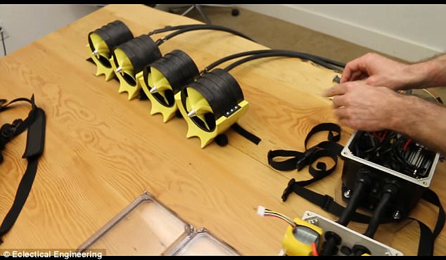 Jetpack 已經成功地在伯克利湖中進行了試驗。Ryan 和 Mike 事先要計算出四台馬達的總輸出電量,並決定了揹包式電池的容量大小。而整套設備都使用了 3D 打印製造。從實驗視頻中我們可以看出,Mike 可以毫不費力的在水底穿梭,看上去就像是一台水下噴氣機。