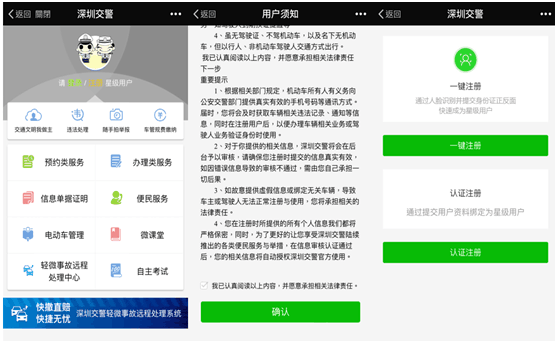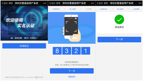 此前,用户在註冊星級用户後,需要另外提交個人車輛、駕駛證信息。為節省用户的辦事時間,提高辦事效率,深圳交警聯合騰訊公司,對註冊系統進行升級,讓用户實名核身更簡單更便捷:打開深圳交警微信公眾號,瀏覽“星級用户認證須知”後確認開通,選擇“一鍵註冊”進入刷臉,上傳身份證正面和身份證反面,然後錄製4位驗證碼視頻上傳,最後設置登錄手機號碼即可完成認證。