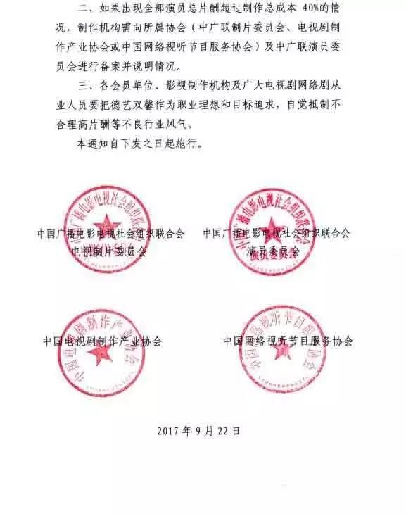 隨着我國影視行業的不斷發展,產業規模不斷擴大,創作播出了一批優秀影視作品,但也出現少數演員不合理高片酬現象,導致影視劇製作成本結構不合理,收入分配比例失衡,影響影視劇整體質量的提升。為貫徹落實五部委聯合下發的《關於支持電視劇繁榮發展若干政策的通知》和全國電視劇工作座談會有關精神,引導製作企業合理安排電視劇投入成本結構,優化片酬分配機制,弘揚“戲比天大”的職業精神,形成良好行業風氣,推動影視行業投入與產出的良性循環,促進行業持續健康發展,現通知如下:
