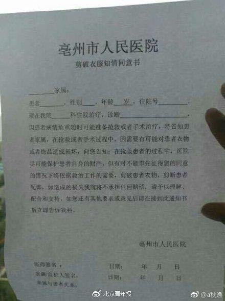9月23日,有網友在微博發帖稱,亳州市人民醫院製作了一份“剪破衣服知情同意書”,並稱該同意書需要患者住院期間由家屬簽訂。知情同意書內容包括患者個人信息以及醫師和家屬簽字等內容,該知情同意書中提到“在搶救或者手術過程中,因需要有可能對患者衣物或者飾品造成損壞,向您告知:……有時不能事先徵得您的同意的情況下將依據救治工作的需要,剪破患者衣物,剪斷患者配飾,如造成的損失我院將不承擔任何賠償……“