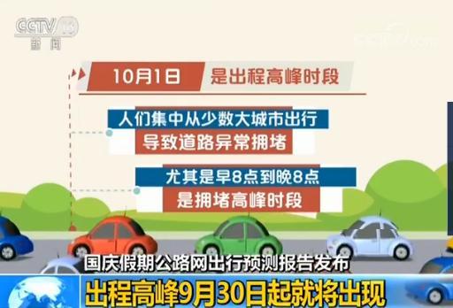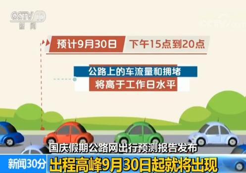 據交通運輸部路網中心預計:國慶中秋假期,全國公路網流量增長在9%—11%。由於部分出行者提前出行,預計9月30日下午15點到20點公路上的車流量和擁堵將高於工作日水平。
