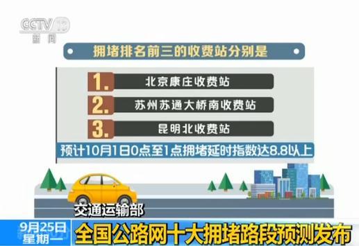 交通運輸部路網中心也進行了預測——10月1日0點高速開始免費通行,根據交通運輸部路網中心的預測,在收費、免費轉換期間,收費站周邊交通壓力增大,擁堵排名前三的收費站分別是,北京康莊收費站、蘇州蘇通大橋南收費站、昆明北收費站,預計0點至1點擁堵延時指數達8.8以上。