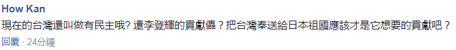 對於李登輝吹捧賴清德,台網友譏諷,真是“臭味相投”,“無論試多少次,結果一樣是虛耗時間的幻想,白痴的‘台獨’”,“把台灣送給日本祖國應該才是他最想要的吧”。