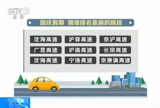 9月30日是各大城市出程車流集中的日子,當天京滬高速、長深高速、瀋海高速排名前三。國慶假期,擁堵排名靠前的路段主要集中在瀋海高速,滬蓉高速,京滬高速,廣昆高速,滬渝高速,長深高速,瀋海高速,寧洛高速和京港澳高速公路。
