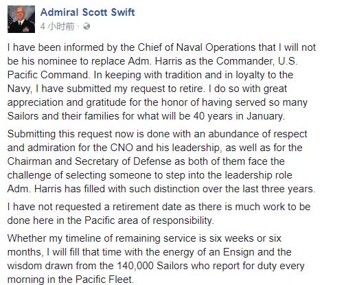 斯威夫特發表聲明表示,他已經接到美國海軍作戰部長的通知,不會提名他接替哈里斯出任太平洋司令部司令。他説,“根據慣例和對艦隊的忠誠,我已提交辭職申請”。