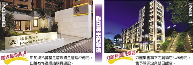 【環球網綜合報道】據台灣“中時電子報”9月26日報道,由於島內觀光業持續不景,全台各地的飯店有爆發轉售潮的趨勢,昨日(25日)一天之內竟然傳出三家飯店易主。包括新加坡私募基金首峯資金管理(AIP)的台北市“慶城福華飯店”大樓,以27億元(新台幣,下同)出手42%產權給勤美公司旗下璞真建設;力麗集團旗下力麗酒店同日以3.25億元價格,將“力麗哲園月潭館”售予關係企業朝日飯店;而志嘉建設即將完工的地上權飯店和坐月子中心大樓“志嘉水曜”,昨天也確定“不玩了”,將以12.8億元的底價,10月18日公開標售。