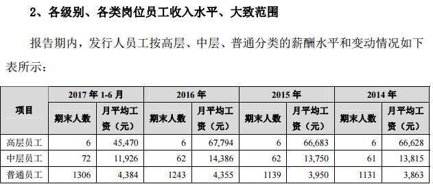 這些財務數據變動,對應着豪能科技的員工人均薪酬在2016年出現了明顯下降,且整體平均降幅高達15%左右。其中,根據相關信息披露,豪能科技的高層員工和中層員工的月薪水平,在2017上半年均明顯下滑,降幅分別高達33%和17%,令人懷疑豪能科技涉嫌在上市前突擊降低員工薪酬,藉此降低成本費用支出、粉飾盈利能力。