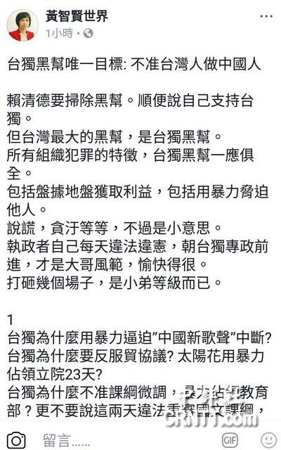 大陸選秀節目“中國新歌聲”24日在台大田徑場舉辦演唱會活動遭到台大學生及島內“獨派”團體鬧場,導致活動喊停,統派團體則是被指在校門口“攻擊學生”;事後,台灣陸委會發言人邱垂正聲稱,會針對主辦單位究責。對此,黃智賢説,在台灣,得罪“獨派”,原來就是犯罪?跟“中國”兩個字沾上邊,就是最大的罪。賴清德在砸場事件後,大聲説自己支持“台獨”,所以“獨派”黑幫不準台灣人做中國人,才是這個劇本真正的主軸。