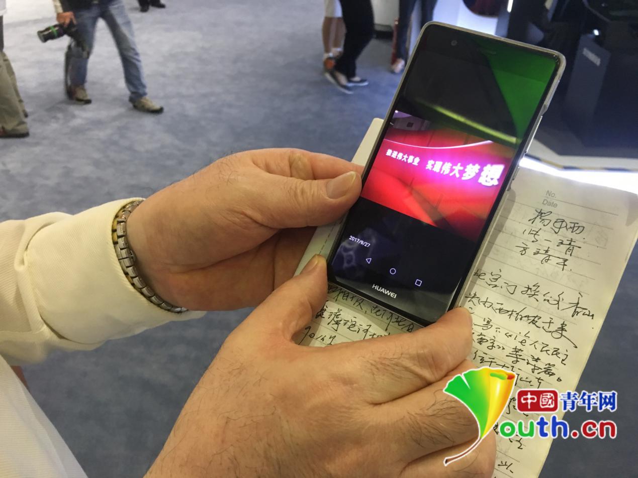 他還給記者看了一張自己拍的照片,這是他在展覽上拍的第一張照片,他説:“我之所以拍下這張照片,是‘推進偉大事業,實現偉大夢想’這幾個字打動了我,現在,我們距離民族偉大復興的中國夢越來越近,我雖然退休了,但是依然很激動,我也打算好好計劃一下退休後的生活,和你們年輕人一起,為這個夢想貢獻力量,我相信,中國夢一定能實現!”