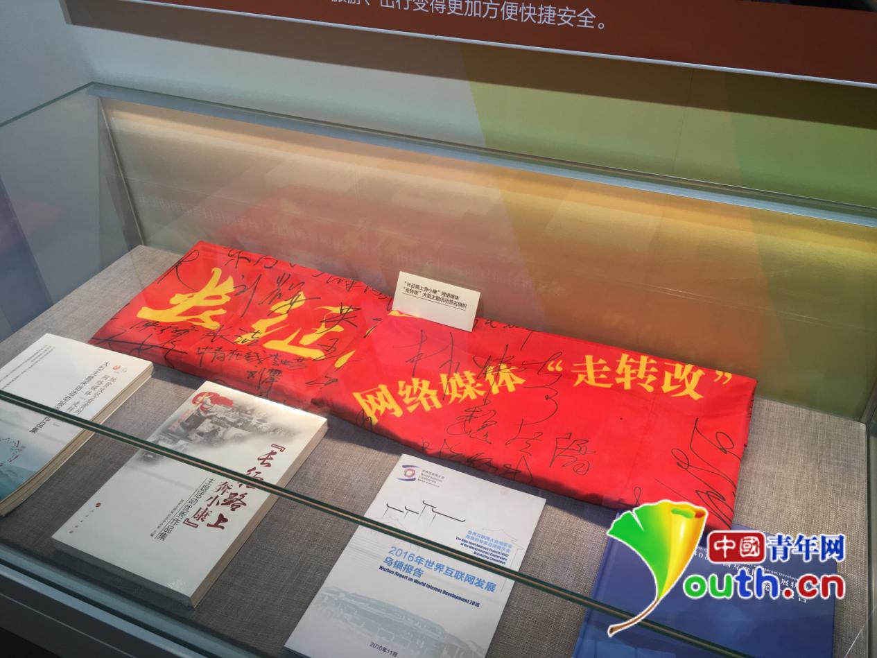 展覽上展示的2016年“長征路上奔小康”網絡媒體“走轉改”大型主題採訪活動的旗幟。中國青年網記者陳琛 攝